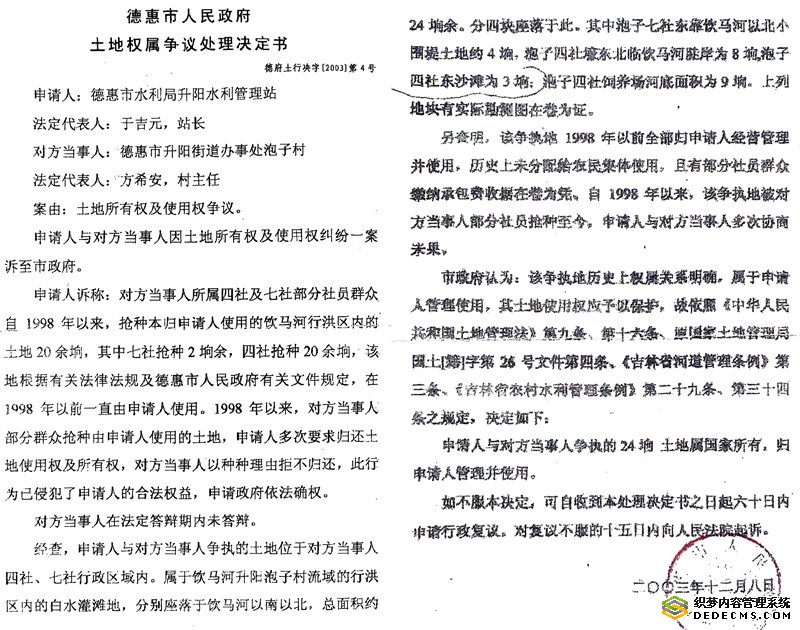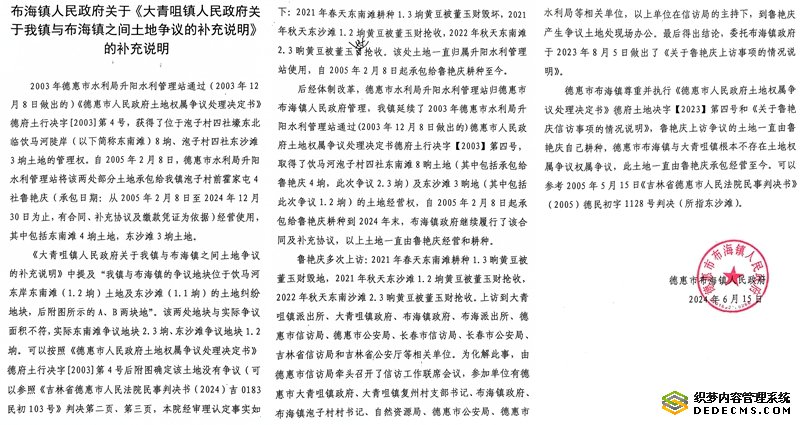 法院经审理认定事实如下:原告方向本院提供了德惠市布海镇人民政府出具的《关于鲁艳庆信访事项的情况说明》,主要内容有:按照德惠市信访联席会议办公室要求,我镇对鲁艳庆信访事项进行调查处理,信访人反映的主要问题是自己承包的土地被董玉财毁地、抢收,其中,2021年春天耕种1.3垧黄豆被董玉财毁坏,2021年秋天1.3垧黄豆被董玉财抢收,2022年秋天2.3垧黄豆被董玉财抢收,要求董玉财赔偿损失;自己继续承包该处土地。调查处理情况:1、因饮马河河道取直,将部分原在饮马河西侧土地调整到饮马河东侧,但该部分土地为更改管理地,一直由德惠市水利局升阳水利管理站管理使用;2、2020.年按照吉林省1号河长令、长春市1号河长令要求,我布海镇政府和大青咀镇政府开展退耕还林工作,对河道非在册土地进行清查清收,清收时以饮马河为界,大青咀政府清理饮马河以东河道地。清收后大青咀政府将河东土地统一发包种草种树,该两处土地由大青咀政府发包给董玉财,其中包括升阳水利管理站包给鲁艳庆的两处土地。董玉财承包河道土地后,仍然种植黄豆,并未种草、种树;3、董玉财毁坏、抢收鲁艳庆的土地为我镇泡子村4社壕东临饮马河陡岸和泡子4社东沙滩士地,此两处士地于2003年12月8日经德惠市人民政府以德府土行决宇(2003)第4号上地权属争议处理决定书确权给德惠市水利局升阳水利管理站管理供用。其中,泡子村4社壕东临饮马河陡岸共8垧,泡子4社东沙滩土地共3垧;2005年2月8日,德惠市水利局升阳水利管理站承包给我镇泡子村前霍家屯4社鲁艳庆(承包日期:从2005年2月8日至2024年12月30日为止,有合同、补充协议及缴款凭证为依据)......处理意见:1.鲁艳庆所反映的土地(2021年春天东南滩耕种1.3垧黄豆被董玉财毁坏,2021年秋天东沙滩1.2垧黄豆被董玉财抢收,2022年秋天东南滩2.3垧黄豆被董玉财抢收。该处土地一直归属升阳水利管理站使用,自2005年2月8日起承包给鲁艳庆耕种,至今还处于承包期内,该处土地耕种权应归鲁艳庆所有;2、董玉财应赔偿2021年、2022年两年毁地、抢收对鲁艳庆造成的损失;3、此后继续由鲁艳庆承包泡子村4社壕东临饮马河陡岸4垧土地和泡子4社东沙滩土地1垧土地直至合同期结束.....