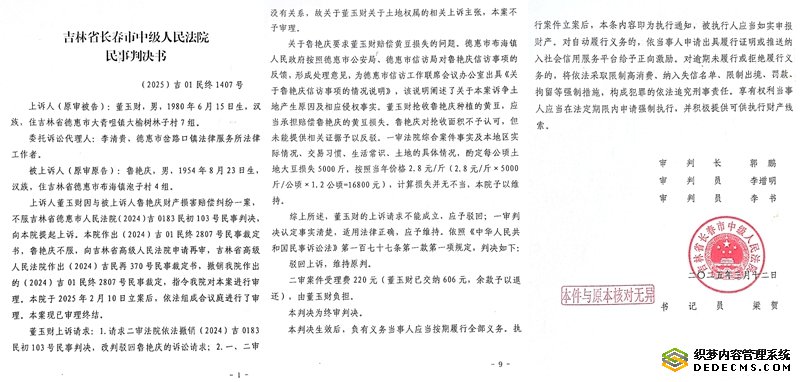 一审判决作出后,董玉财不服提起上诉。据长春市中级法院 (2025)吉01民终1407号民事判决书记载:董玉财因与被上诉人鲁艳庆财产损害赔偿纠纷一案,不服德惠市法院(2024)吉0183民初103号民事判决,向本院提起上诉。本院作出(2024)吉01民终2807号民事裁定书,鲁艳庆不服,向吉林省高级法院申请再审,吉林省高级法院作出(2024)吉民再370号民事裁定书,撤销我院作出的(2024)吉01民终2807号民事裁定,指令我院对本案进行审理。本院于2025年2月10日立案后,依法组成合议庭进行了审理。但是,长春市中级法院终审判决,驳回上诉,维持原判。