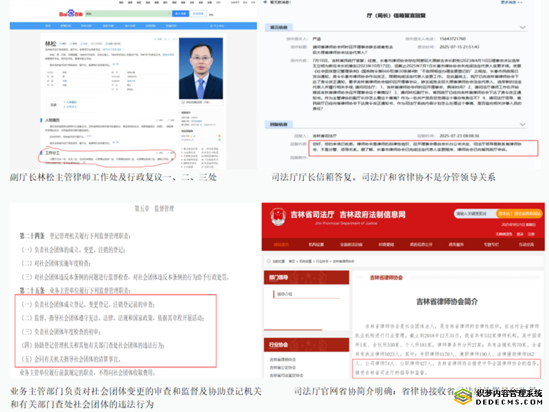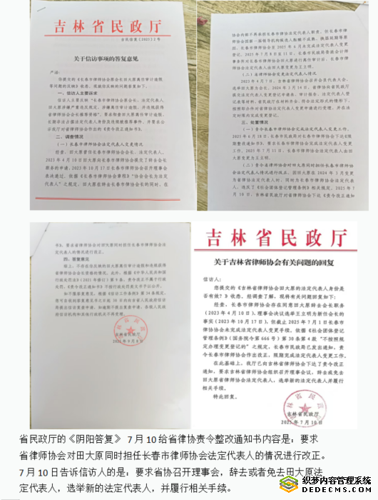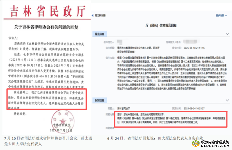 2023年4月,田大原在未卸任长春市律师协会会长的情况下,便被吉林省司法厅主管律师协会的副厅长林松推荐为省律师协会会长候选人,并“顺利”当选。副厅长林松在田大原未能提供由民政局委托的会计师事务所出具的离任审计报告的情况下,依然违法批准通过了其法定代表人身份的变更审核。这一明显的违规状态竟然持续了长达两年多的时间,直至 2025年7月10日,吉林省民政厅出具的《关于吉林省律师协会有关问题的答复》,明确指出:田大原同时担任省、市律师协会法定代表人,违反《社会团体登记管理条例》; 在此基础上,民政厅已向吉林省律师协会下达了《责令改正通知书》,要求吉林省律师协会组织召开理事会议,辞去或免去田大原省律师协会法定代表人,选举新的法定代表人并履行相关手续。
