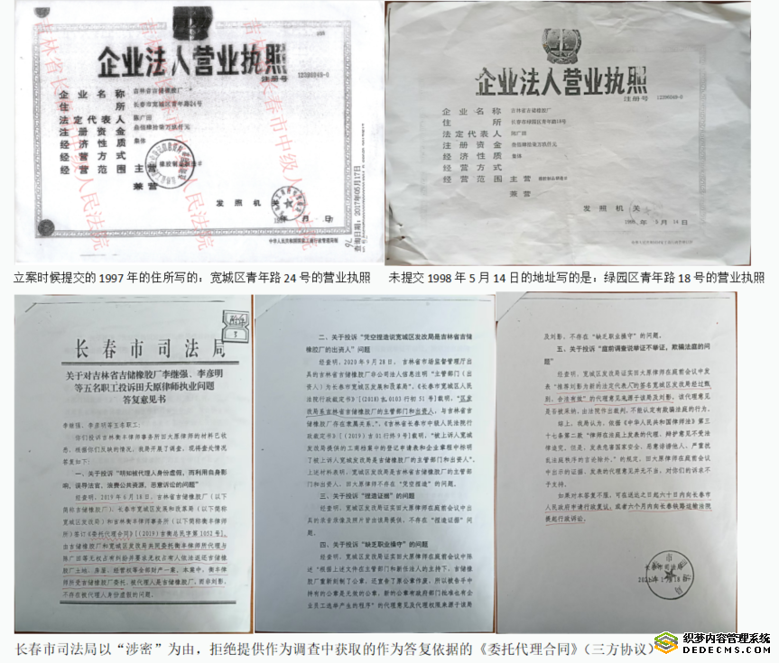 2019年6月,田大原以其担任主任的吉林衡丰律师事务所名义,与长春市宽城区发改局局长郭中凡、副局长纪勇签订了《委托代理协议》(一份三方协议),公然帮助宽城区的发改局制造虚假诉讼主体,拿着作废的营业执照以及伪造的企业公章,以橡胶厂的名义对本厂职工提起了诉讼。在长春市中级法院审理的(2019)吉01民初913号案件中,承办法官郭宇采信了田大原一方提交的所谓“职工代表大会决议”复印件作为关键证据,并据此认定职工“无权占有”企业资产。然而,该决议既无原件可供核对,其上职工签名的真实性也存有重大疑问,其证据资格和证明力均严重不足。法院以“职工无社保记录”为由否认其职工身份,将其认定为“来路不明人员”,却刻意回避了企业早已被吊销营业执照、职工客观上无法继续缴纳社保这一关键事实,使用已作废的营业执照和伪造的公章能够成功立案并推进诉讼,本身就已涉嫌违反《中华人民共和国刑法》第三百零七条之一的规定,构成了虚假诉讼罪。这不仅严重损害了涉案职工的合法权益,更是对司法公正和诉讼秩序的公然挑战。