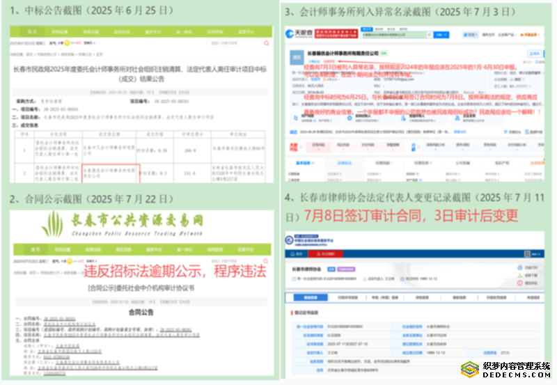 此外,根据《中华人民共和国政府采购法实施条例》第五十条规定,采购人应自合同签订之日起2个工作日内在省级以上财政部门指定媒体公告合同。而长春市民政局与这家会计师事务所于2025年7月8日签订合同,却直至7月22日才在长春市公共资源交易网予以公示,延迟长达14天,远超法定期限。针对这个问题,长春市民政局答复:我局与中标供应商签订合同后第一时间在长春市公共资源交易网按照法定流程进行合同公示,提交过程中,系统弹出错误提示,无法上传合同文本及相关附件。