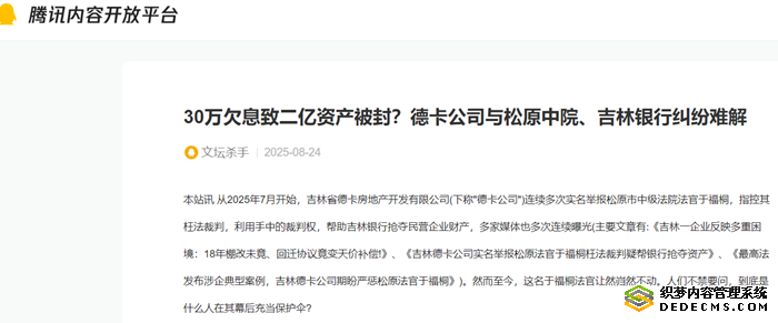 本站讯 从2025年7月开始,吉林省德卡房地产开发有限公司(下称"德卡公司")连续多次实名举报松原市中级法院法官于福桐,指控其枉法裁判,利用手中的裁判权,帮助吉林银行抢夺民营企业财产,多家媒体也多次连续曝光(主要文章有:《吉林一企业反映多重困境:18年棚改未竟、回迁协议竟变天价补偿!》、《吉林德卡公司实名举报松原法官于福桐枉法裁判疑帮银行抢夺资产》、《最高法发布涉企典型案例,吉林德卡公司期盼严惩松原法官于福桐》)。然而至今,这名于福桐法官让然岿然不动。人们不禁要问,到底是什么人在其幕后充当保护伞?