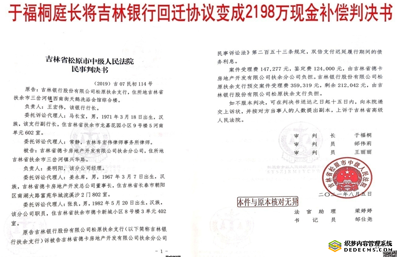 "这不是评估,简直是明抢!"德卡公司负责人愤怒地表示,协议明确约定"回迁安置",法官却强行变更为"货币补偿",且评估价与实际价值严重背离。德卡公司直指,法官于福桐的判决完全站在银行立场上,"相当于用司法权帮银行撕毁合同,再逼我们用高价买自己早已备好的回迁房"。最终,法院依据该评估结果判决德卡公司支付2198万余元现金(案号(2019)吉07民初114号),导致企业直接损失超千万元。