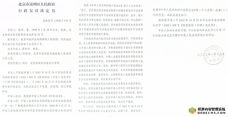 ——2022年10月,镇政府作出的两份限期拆除及强制拆除决定书,于2023年2月被通州区政府复议认定违法并撤销;